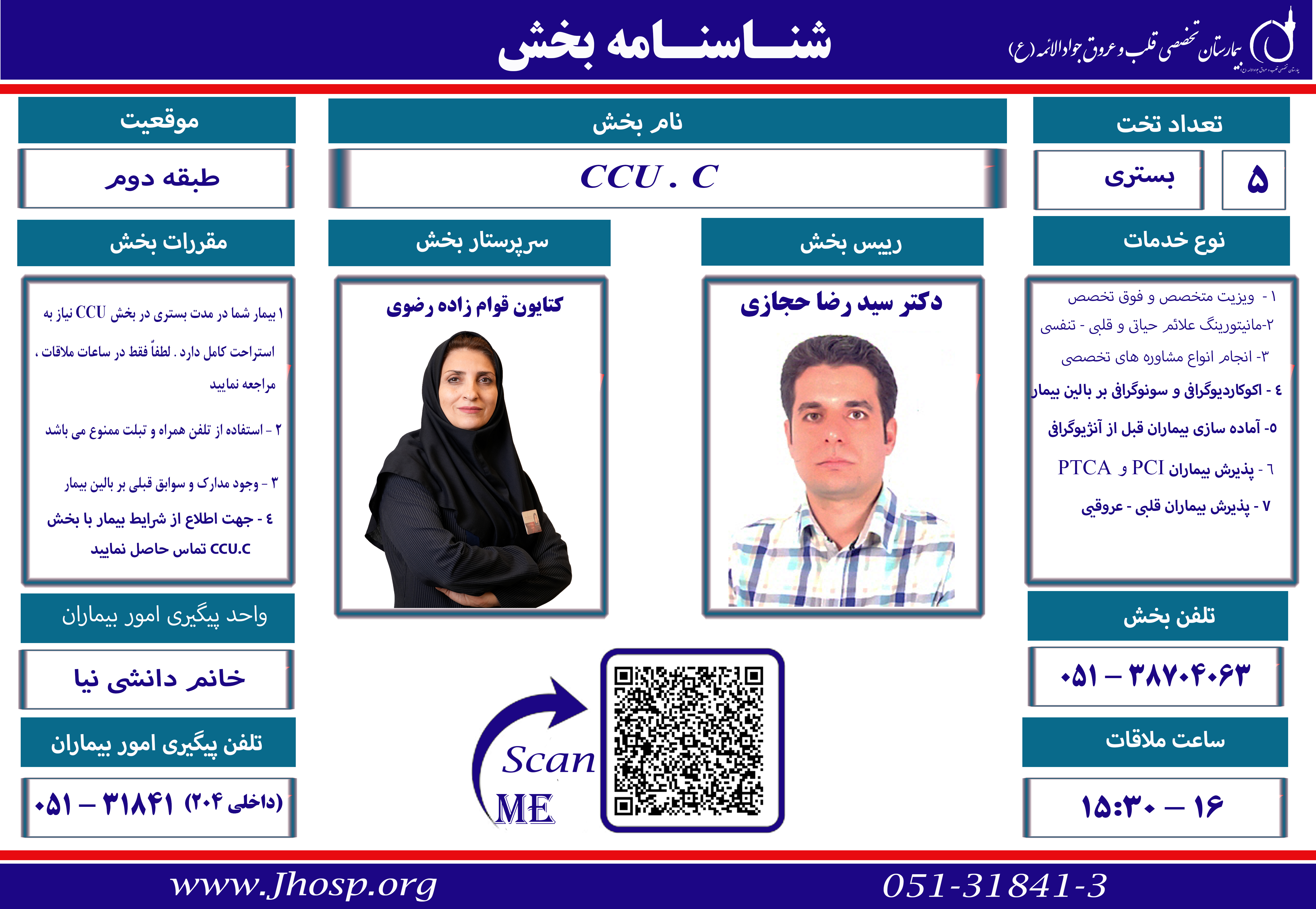 از جمله نکات ارزشمند بخش CCU-C وجود پزشکان حاذق و کارکنان دلسوز، متعهد این بخش می باشد.
