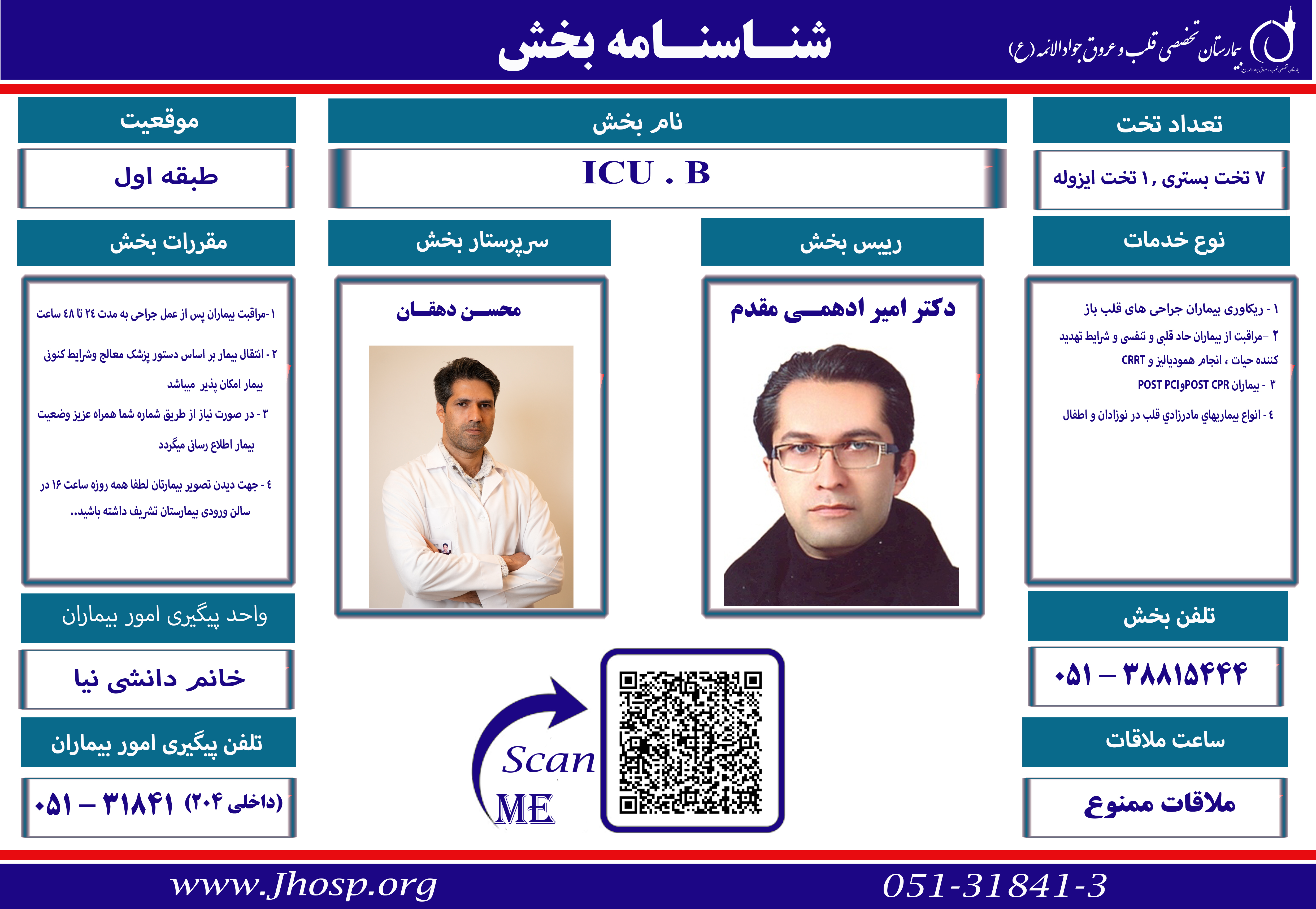 بخش ICUB به مساحت 416 متر که از تاریخ 1/02/1385 به طور رسمی افتتاح شده است و در طبقه اول بیمارستان و هم جوار اتاق عمل قلب باز قرار دارد. دارای هشت تخت بزرگسال که یکی از این تخت ها داخل اتاق ایزوله می باشد. این بخش شامل اتاق پزشک، اتاق کار، اتاق ایزوله، اتاق استراحت پرستاری، اتاق شستشوی وسایل کثیف، انبار دارو و تجهیزات، اتاق رختکن پرسنل و سرویس بهداشتی پرسنل و بیماران می باشد.